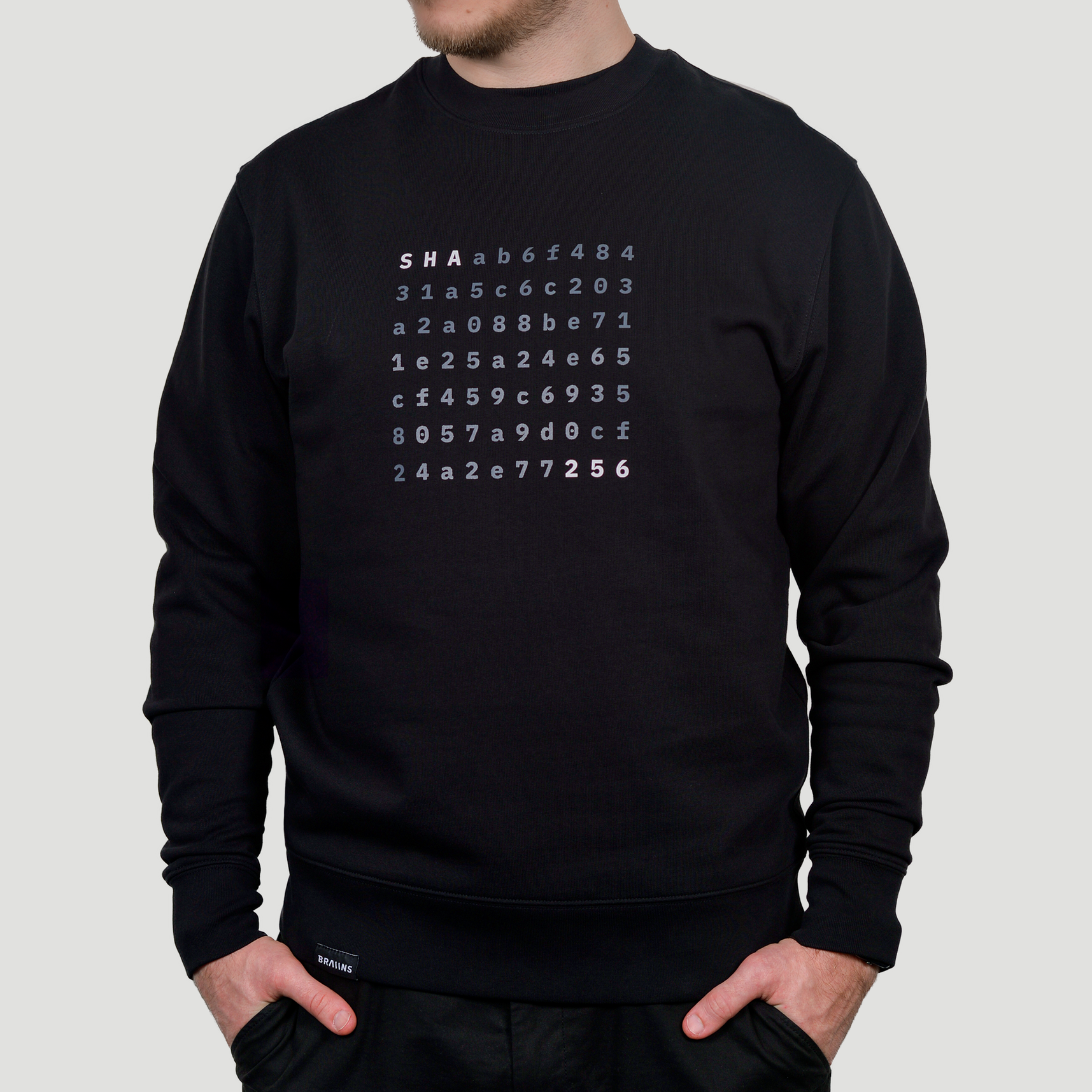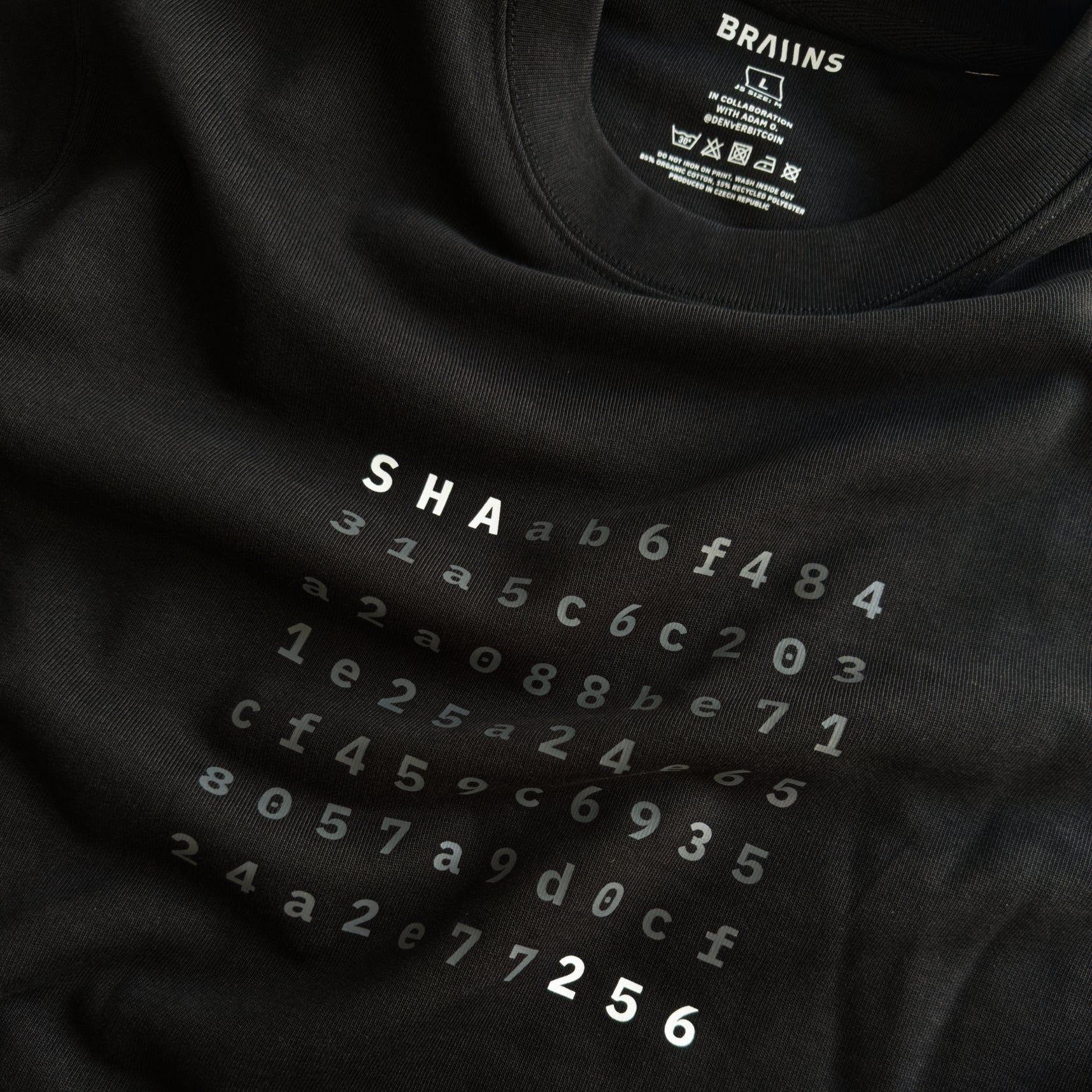 Teaming up with fellow bitcoiner Adam O., also known as DenverBitcoin, we've crafted a one-of-a-kind SHA-256 design for our new sweatshirt. While it may go unnoticed by the average passerby, you'll recognize the hidden hash that reveals Adam's signature phrase, 'Mine Your Business.' The top-notch screen printing is accompanied by a textile label featuring the Braiins logo, all proudly made in Prague, the birthplace of our company.